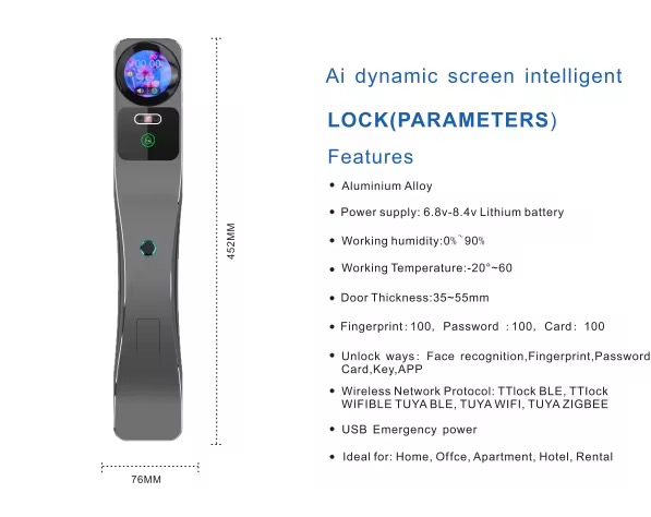 Fingerprint, password, card swiping, facial recognition, key, temporary password, remote unlocking, video intercom, rear screen display, Tuya app