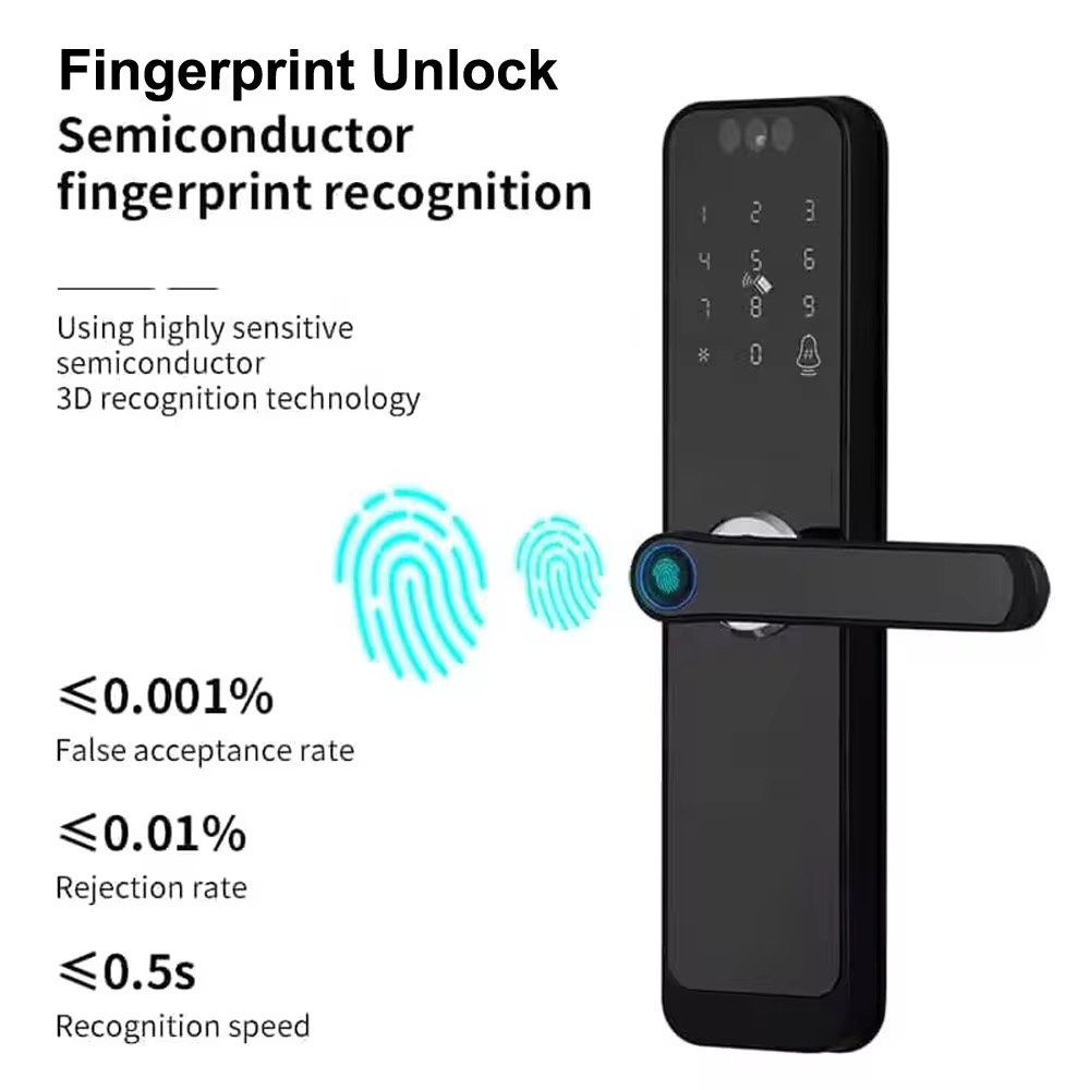 Fingerprint, password, card swiping, facial recognition, key, temporary password, remote unlocking, cat-eye capture, rear view screen, Tuya app